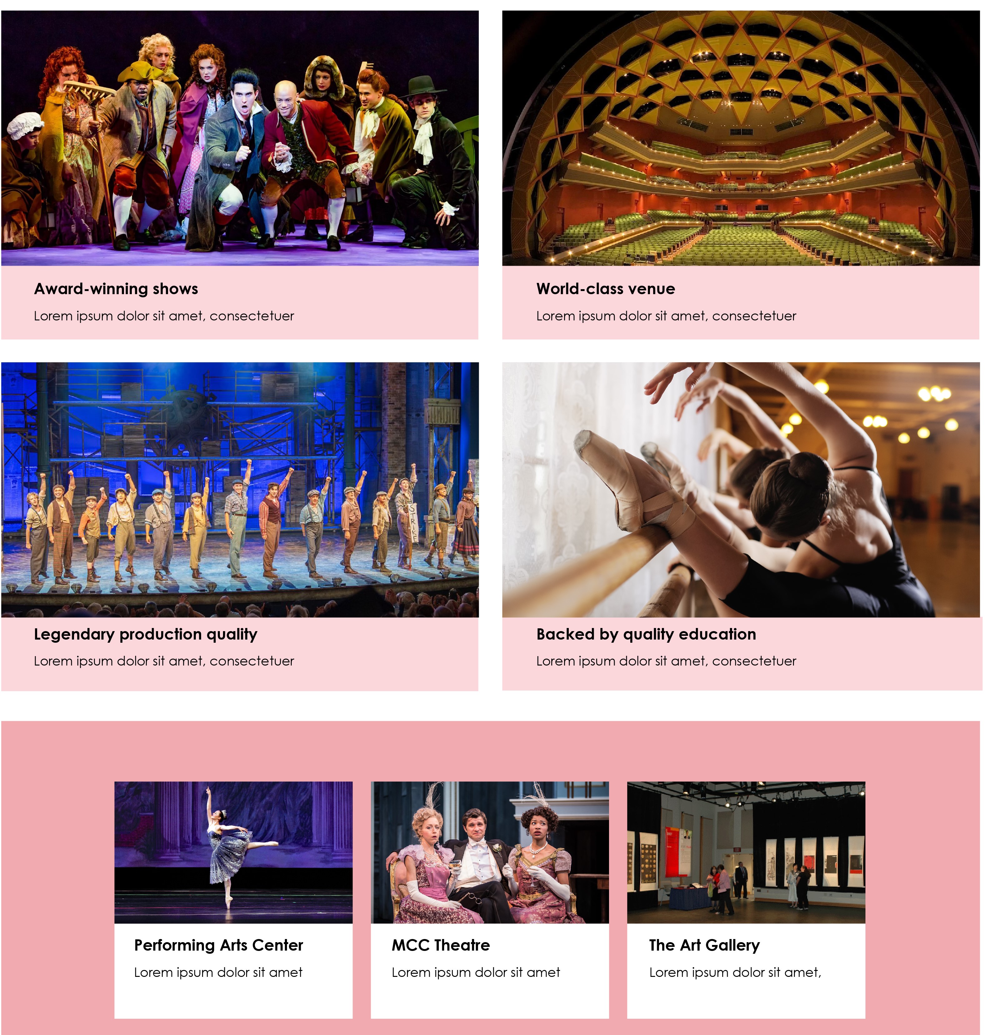 A wireframe that was created for a mock arts center. This assignment was a layout design only, and was not coded into a functional website. The design was made using Adobe InDesign.